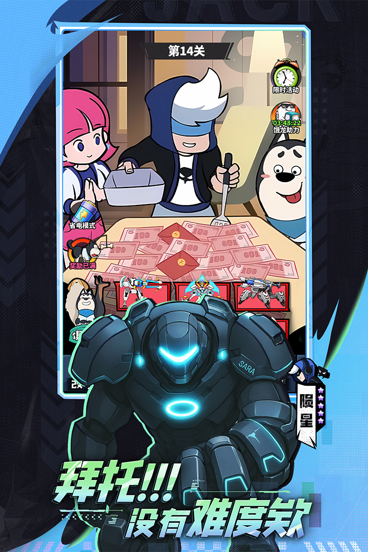 ,特攻冲破次元壁,杰克集结组建自己的特攻魔王小队,丰富多元的杰克养成线;纵向战斗融合赛博机甲美漫风格,杰克特攻队游戏简介